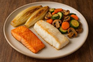 POISSON du JOUR : Assiette du pêcheur, crémeux de petits pois avec endive braisée et poêlée de légumes
