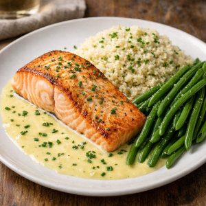 POISSON du JOUR : Pavé de saumon, beurre blanc avec semoule et haricots verts persillés
