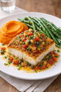 POISSON du JOUR : Pavé de merlu en viennoise, sauce vierge avec mousseline de carottes et haricots verts